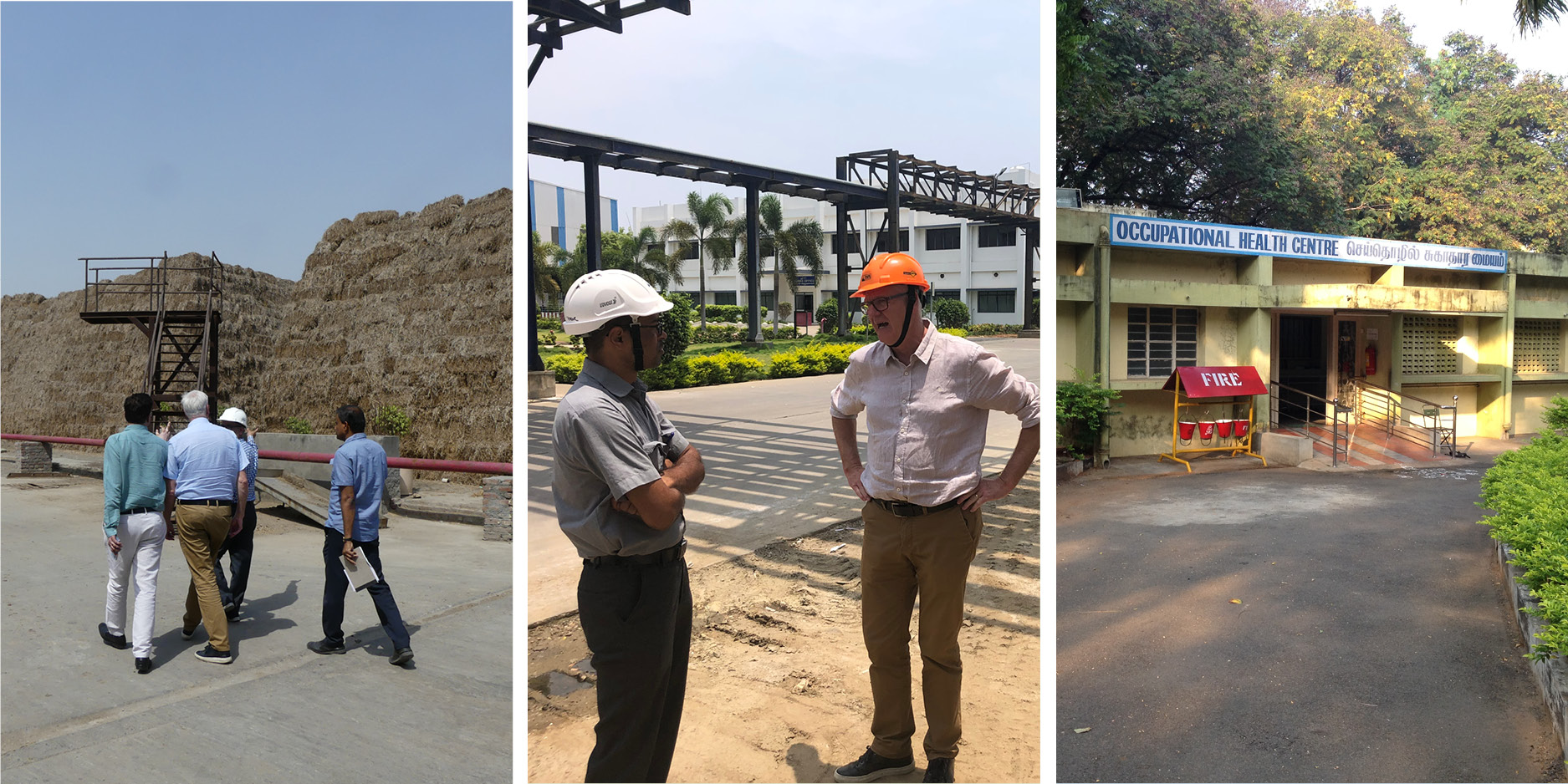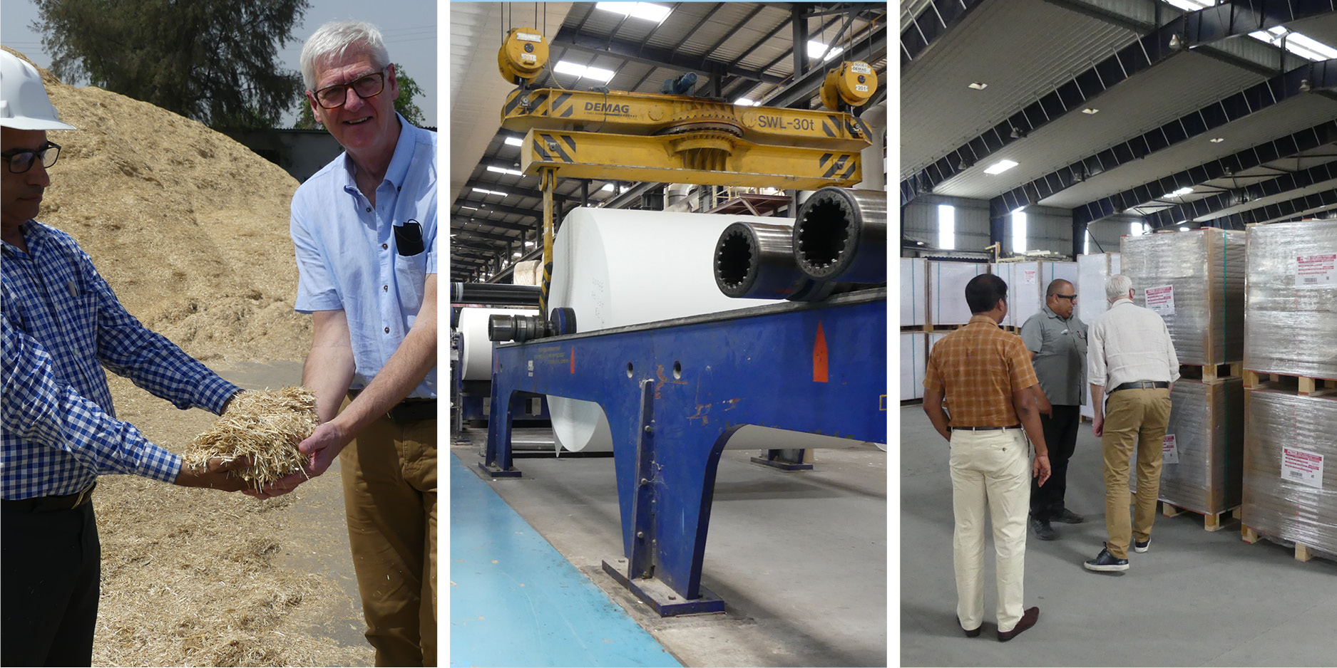 Wir besichtigen die Fabriken und Standorte und erhalten immer einen Blick hinter die Kulissen. Wir sehen die Einrichtungen, die den Mitarbeitern und Einheimischen zur Verfügung stehen, darunter ein medizinisches Zentrum, ein Tempel, eine Kirche und eine Moschee, Schulen mit kostenlosem Bustransport für die Kinder und verschiedene Sportanlagen. Aber auch die Bio-Vergärungsanlagen, die aus landwirtschaftlichen Abfällen, die nicht für Papier geeignet sind, grüne Energie (Methan-Biogas) erzeugen, um CO2 einzusparen. Eine Tour zu den riesigen Wasserbecken, in denen während des Monsuns überschüssiges Flusswasser gesammelt wird, damit die Papierfabrik kein Grundwasser verwenden muss. In Indien gibt es immer wieder Trockenperioden und die Landwirte brauchen Grundwasser, um ihre Pflanzen anzubauen. Aufgrund der Zusammenarbeit zwischen den Landwirten und der Papierfabrik besteht ein Einvernehmen darüber, dass die Papierfabrik im Gegensatz zu vielen europäischen Papierfabriken kein Grundwasser verwendet. Wir nehmen uns auch die Zeit, potenzielle andere Papierfabriken zu besuchen, die landwirtschaftliche Abfälle als Rohstoff verwenden, und treffen uns dort persönlich.