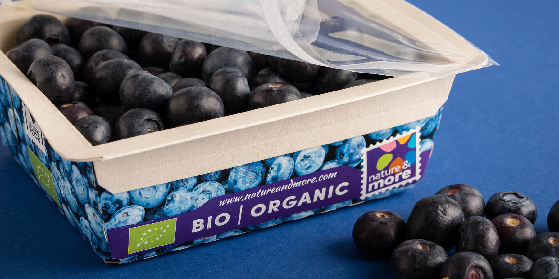 In dem Beispiel unten sehen wir Bio-Blaubeeren der Marke Nature & More. Diese nachhaltige Kartonverpackung wurde mit einem flachen Siegelrand entworfen, um die Verpackung schnell, sicher und gut verschlossen zu halten und dennoch maximale Sichtbarkeit zu bieten. Natürlich ist es auch möglich, die Bio-Kartonverpackung so zu gestalten, dass sie mit einem transparenten Bio-Übersiegelungsdeckel anstelle eines flachen Siegelrandes verschlossen wird.