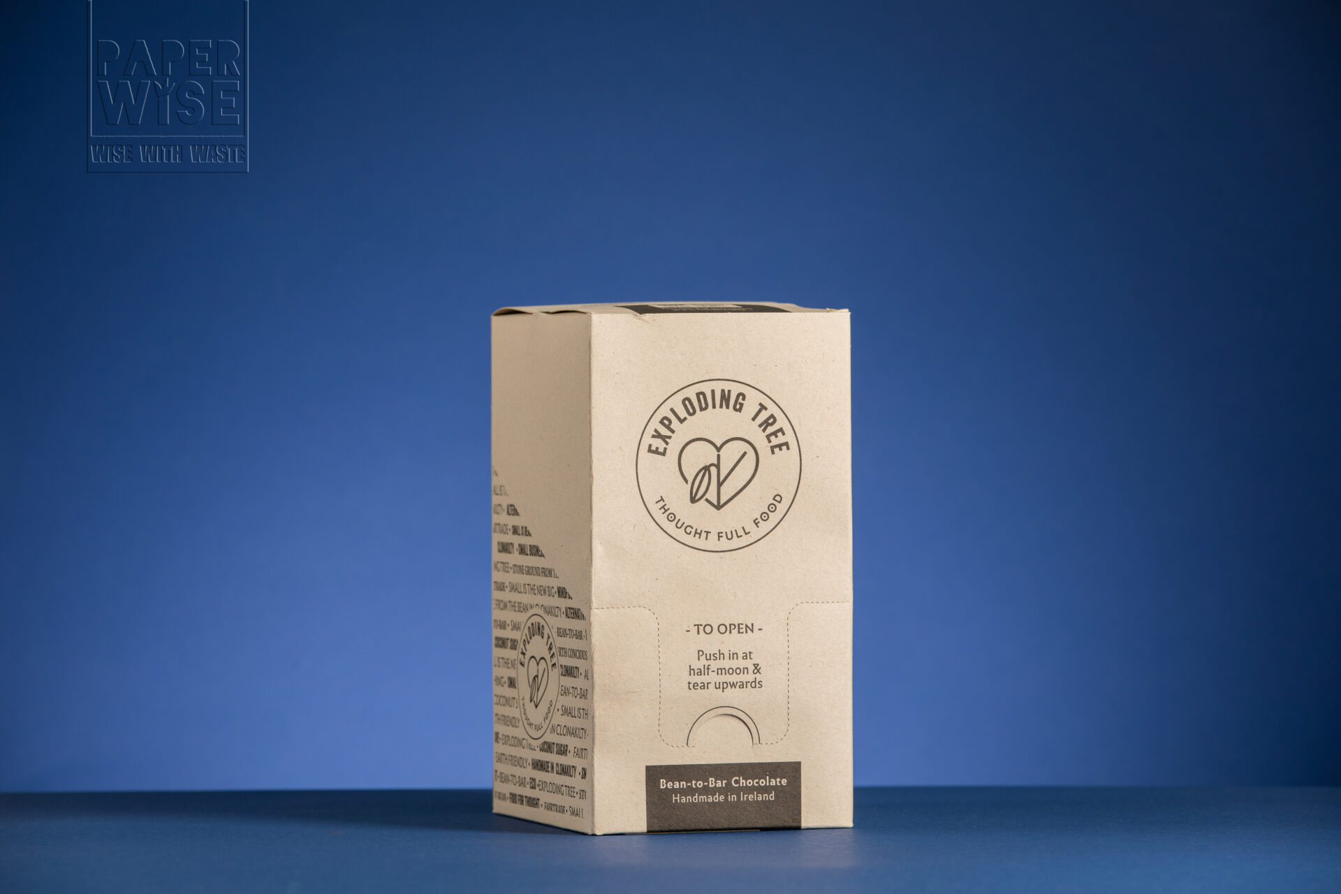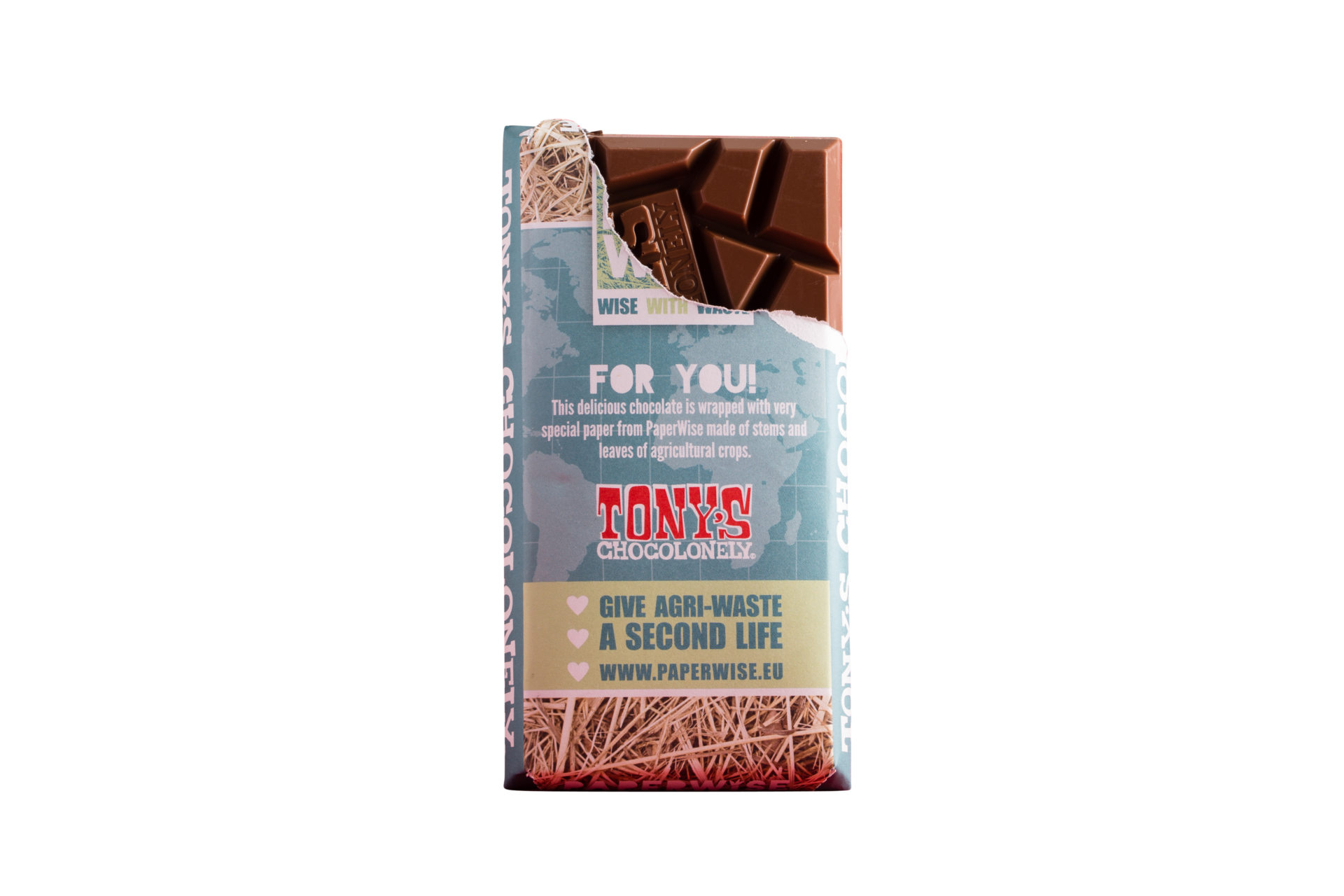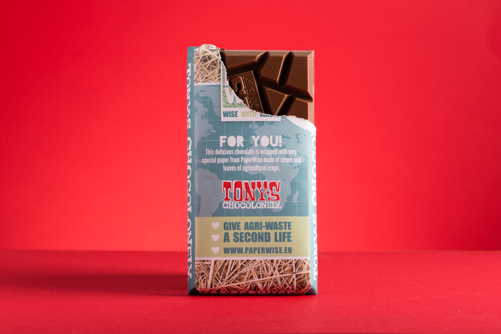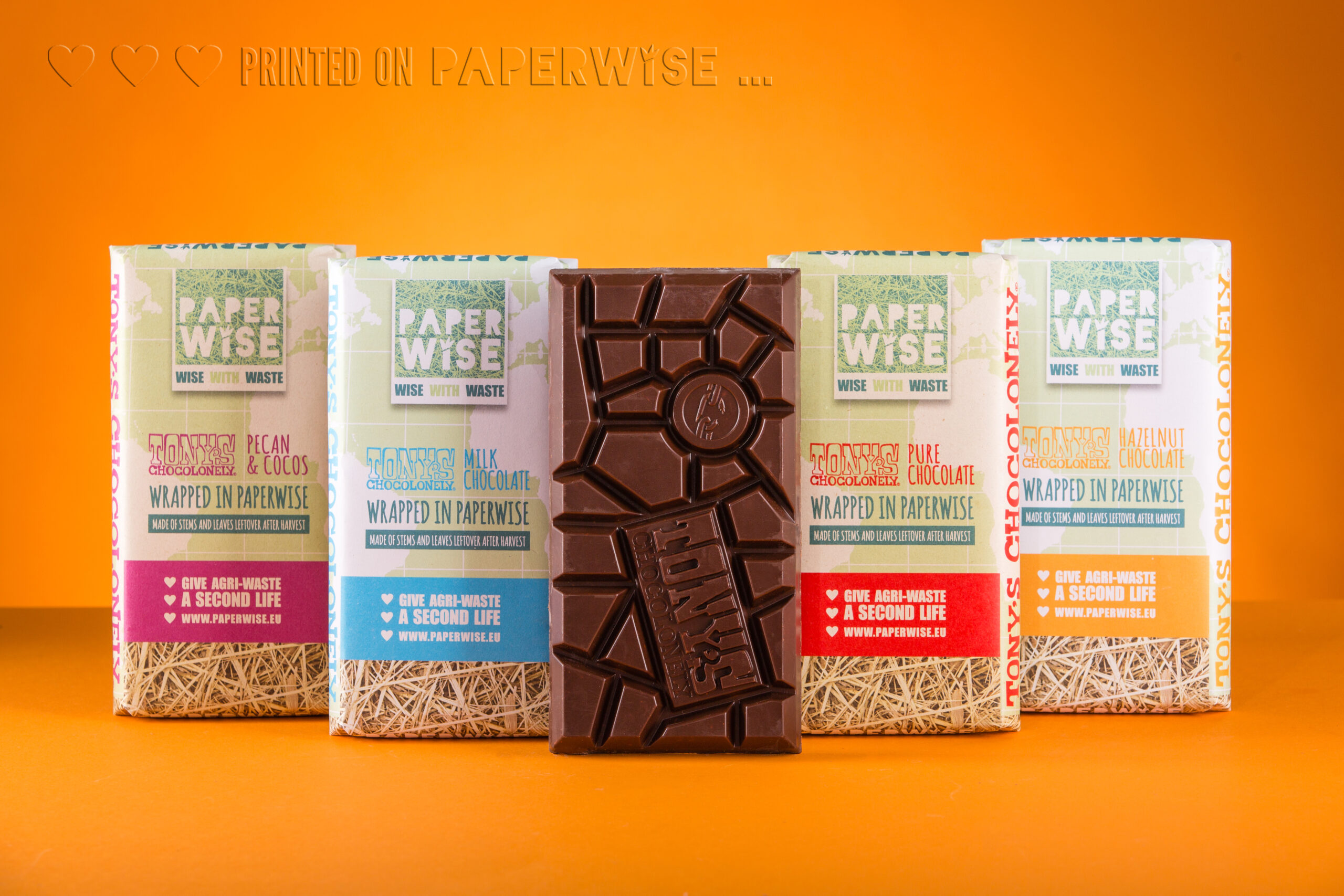 Chocolate packaging consists of food-safe packaging for bars, bonbons, and tablets, made from PaperWise paper and paperboard based on agricultural waste.