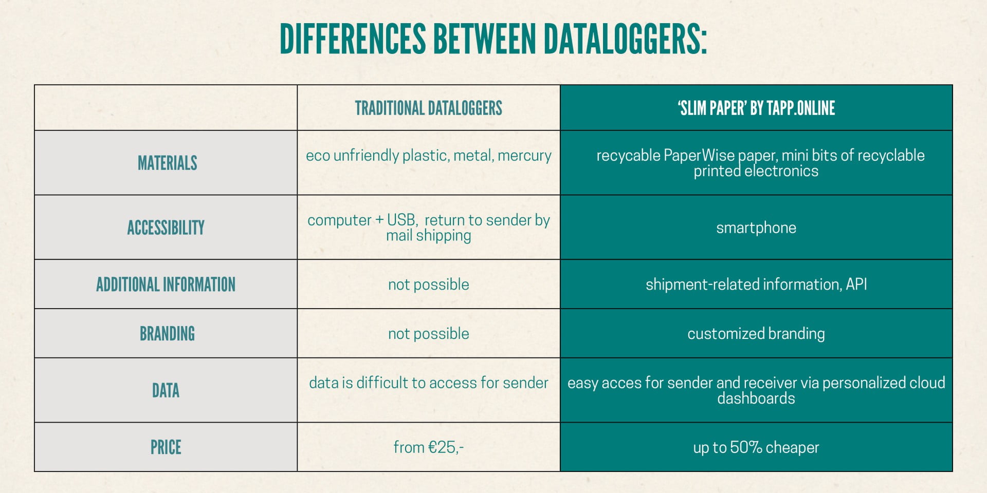 De Slim Papier sensoren van Tapp.online zijn in vele duurzame verpakking van PaperWise te verwerken, op maat gemaakt en te voorzien van een eigen ontwerp. Eigen branding is dus mogelijk in tegenstelling tot traditionele dataloggers. En PaperWise voorzien van Slim Papier sensoren is gewoon te recyclen via de normale oud papierstroom. De sensor, chip en inkten hebben geen negatieve gevolgen voor het papierrecycling proces, waar traditionele dataloggers gepaard gaan met plastic, metaal en soms zelfs kwik. De inkten verlaten de papierfabriek samen met inkten van ander oud papier. De chip is een heel klein stukje metaal wat samen met nietjes en paperclips wordt afgevoerd via het restafval. En het PaperWise papier wordt weer hergebruikt voor nieuw papier. Kiezen voor PaperWise voorzien van Slim Papier sensoren is kiezen voor een duurzamer én kostenbesparend alternatief t.o.v. traditionele dataloggers.